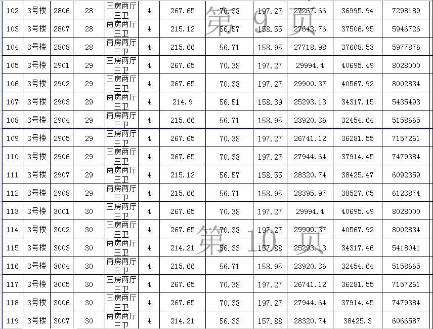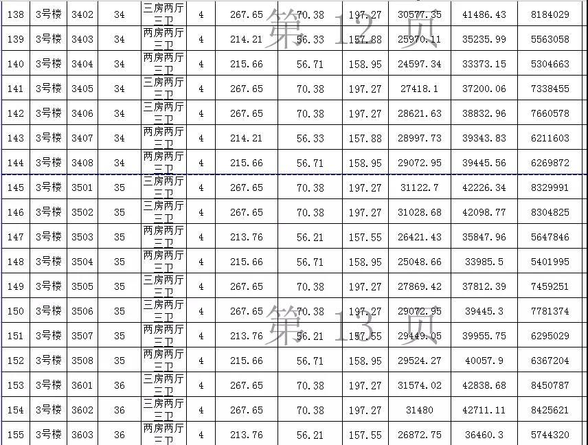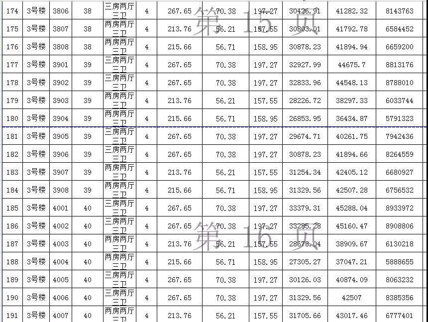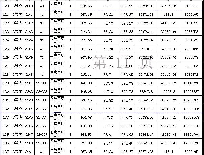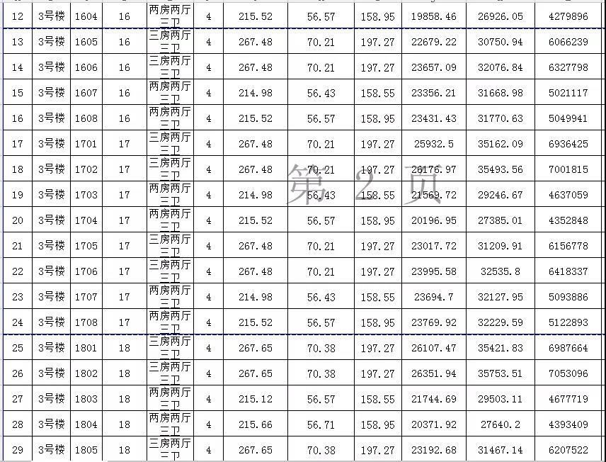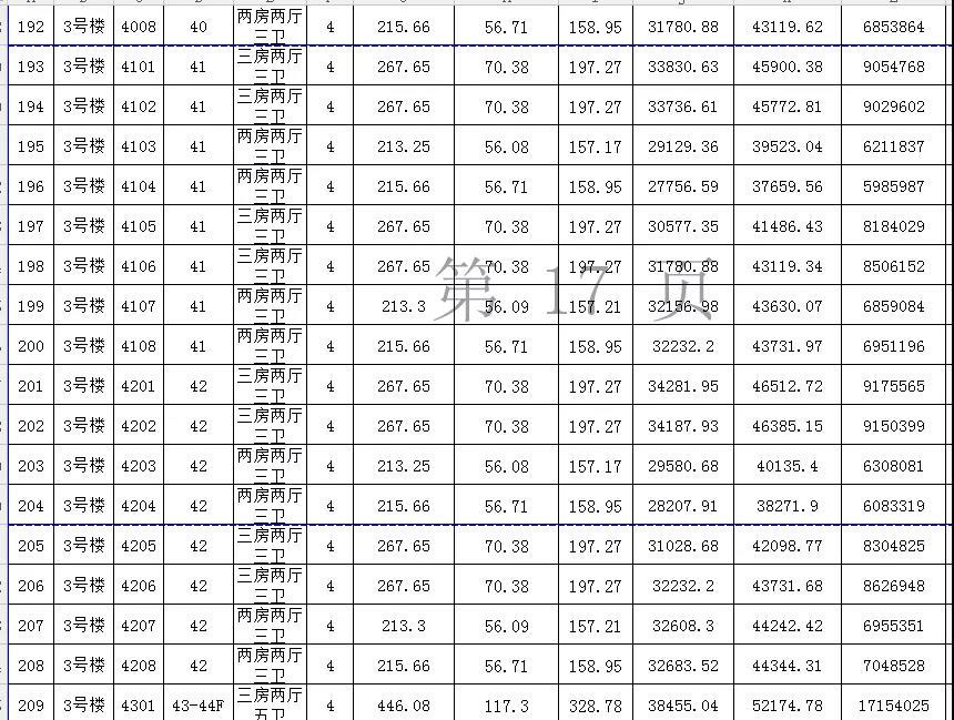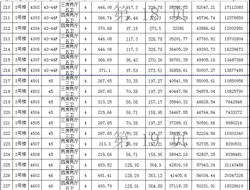 备案价最低的是15楼的1504单元,这是一个两房两厅三卫的单位,仅为19294.31元/㎡,总售价约426万元,户型建筑面积220.95㎡,公摊面积62㎡,套内面积158.95㎡。
