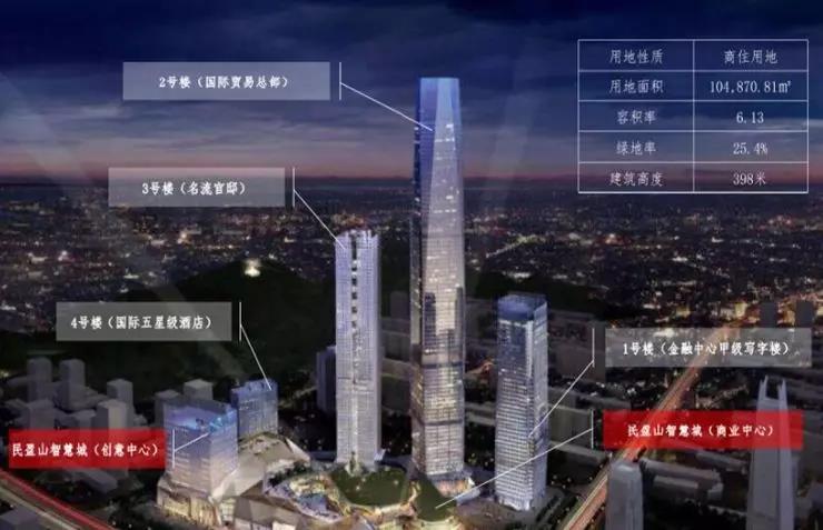 据公开资料显示,国贸中心占地约10.4万㎡,总建面约103万㎡,总投资近100亿元。由1幢纯商业裙楼和t1、t2、t3、t4、t5共5栋高层或超高层建筑组成,其中商业购物公园民盈·国贸城约30万㎡(不含停车场),停车位超过4千个,写字楼建面约32万㎡,住宅约6.4万㎡。