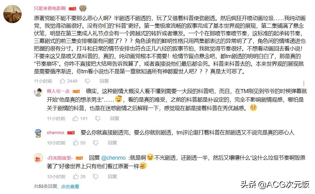 一些原作党要是真的诚心想要科普,动画党也不是不能接受,可奇怪的是他们只科普一半。话只说一半是最让人难受的,也是动画党最受不了的,所以只要翻翻评论区,就能看到原作党的科普内容,以及动画党的吐槽声。看来原作过于有名也是个麻烦事,这部番才播出第二集,剧透就已经十分严重了,评论区的氛围也变得乌烟瘴气。