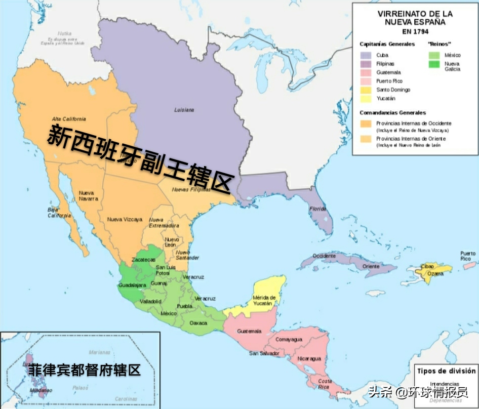 ▲新西班牙副王辖区的广袤美洲殖民地,及菲律宾和密克罗尼西殖民地(左下角框内)