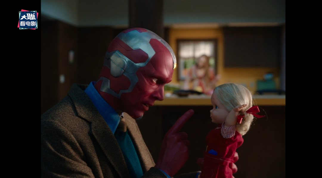 旺达后来被关在类似监狱的房间里,看的依然还是美国的家庭情景剧,片中小女孩抱着的洋娃娃,在第3集中和幻视手中练习换尿布的布娃娃一样。