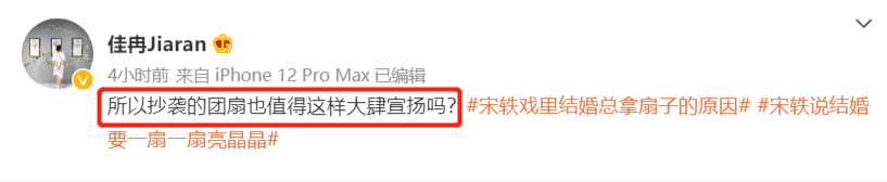 其实从演员所带的话题还有各方截取的动图分析,宋轶手持团扇很显然是剧方强调的重点,这也引发原作者不满,她先后发布三条内容怒斥剧方抄袭行为,起初对于作品被抄袭她直言:“人已麻木。”
