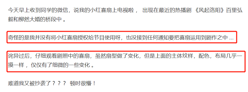 " 原作者发文起初是收到同学消息,才发现自己的小红喜扇出现在热播剧中,可奇怪的是自己没有给剧方授权,也没收到任何通知,紧接着她就马上对比剧里道具和自己原创作品的区别,发现除了扇形有些变化之外,主体纹样、配色、布局几乎都一模一样。值得一提的是,这把小红喜扇因为惠若琪结婚时用过,所以也算小有知名度。