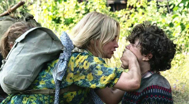 伊芙琳怕小婴儿发出声音引来怪兽,于是把几个月大的小婴儿放进了隔音的木箱子里。为了防止缺氧,在箱子外面还要绑上氧气瓶。被怪兽追赶的时候,伊芙琳和大儿子提着箱子狂奔的镜头令人动容。