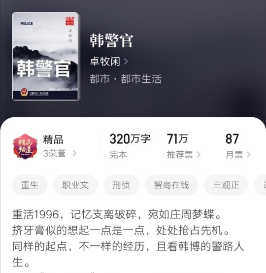 此书是写实向都市警察官场文,讲诉的是基层干警的工作与生活,主角人情练达,既能坚持原则,也会顺势机变,人物三观极正。行文很接地气,但节奏紧凑,描写朴实,极富时代气息;人物塑造栩栩如生,主角配角都生动灵活;行文朴实无华,处处都是生活点滴,读之很有生活气息,亲和力强;文笔功底深厚,整体阅感流畅自然,故事讲述的引人入胜,值得一看。