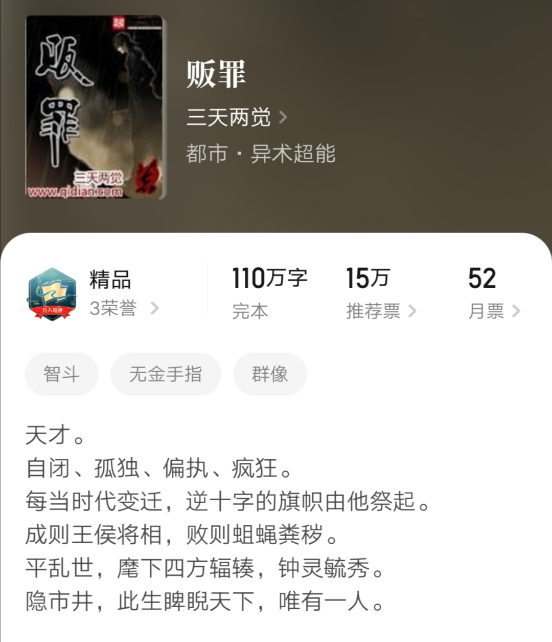 文如其名,贩卖罪行,主角高智商,心理不太健康,有点像个疯子。这是一部非常独特的小说,融合了罪案、魔幻、恐怖、战争等众多元素,情节离奇诡异,风格偏惊悚,节奏紧凑,人物塑造也非常成功,很多配角令人印象深刻。