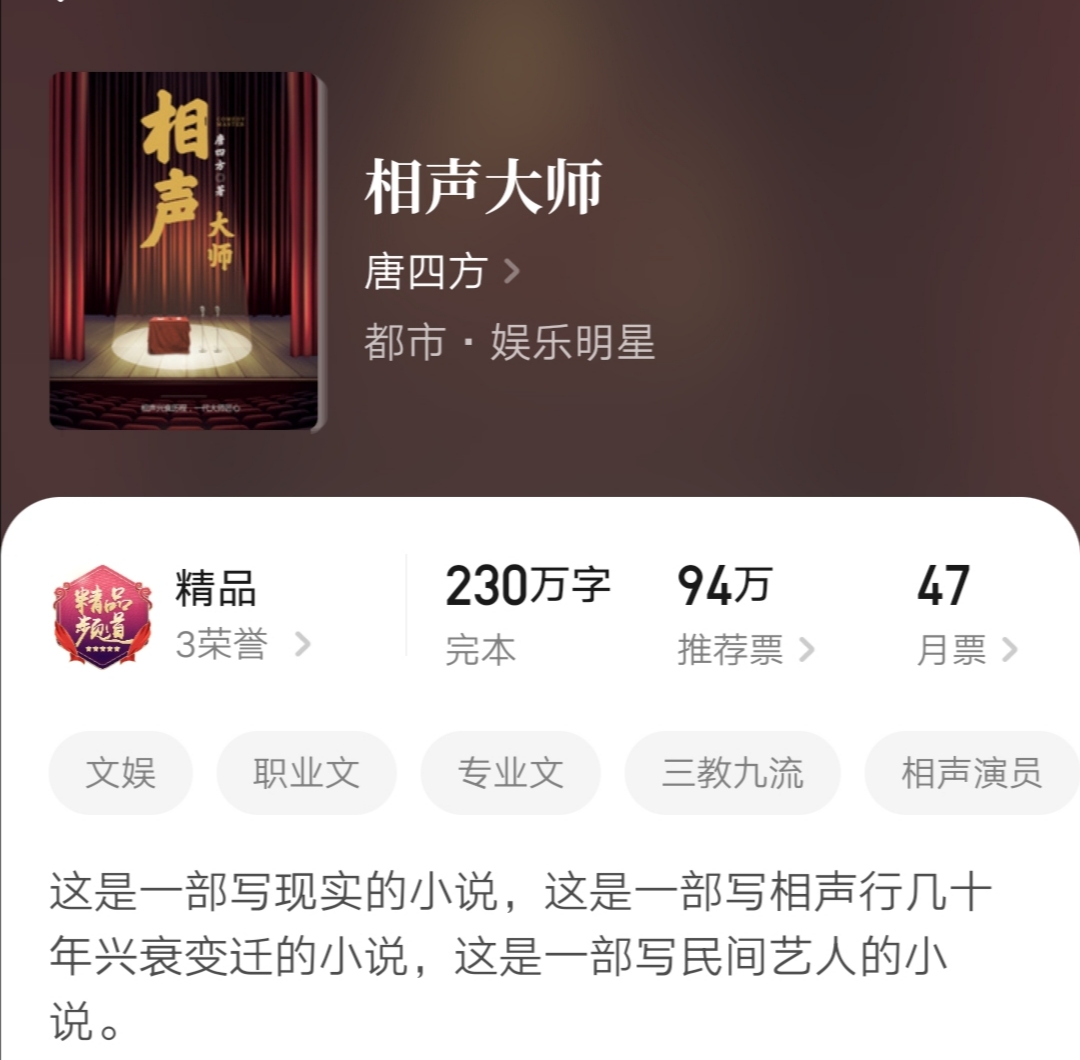 这也是一本比较小众的小说,去年就有朋友和我提到过,并且给我看过一些片段截取,当时只是感慨作者文笔优秀。此书以历史为背景,让读者看到了相声艺术百年间的发展历程和那些相声大师的传奇人生。题材偏现实,是本好书。