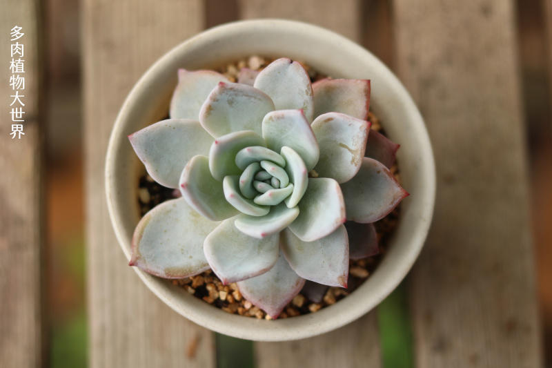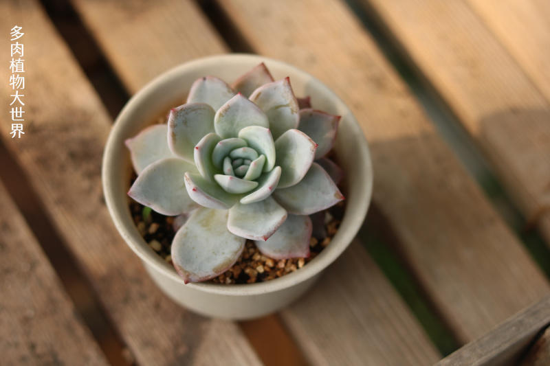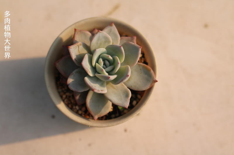 特征:植株莲座状,叶片长勺形,肉质,叶片上覆白粉,但很容易被蹭掉,光照充足且温差加大时,叶色紫红。