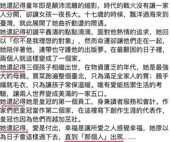 (1963年)某日,平鑫涛带着刚出版《窗外》的琼瑶来家里吃饭,林婉珍热情招待,就像以往对待皇冠的新锐作家们一样,从没料到婚姻会被她介入。