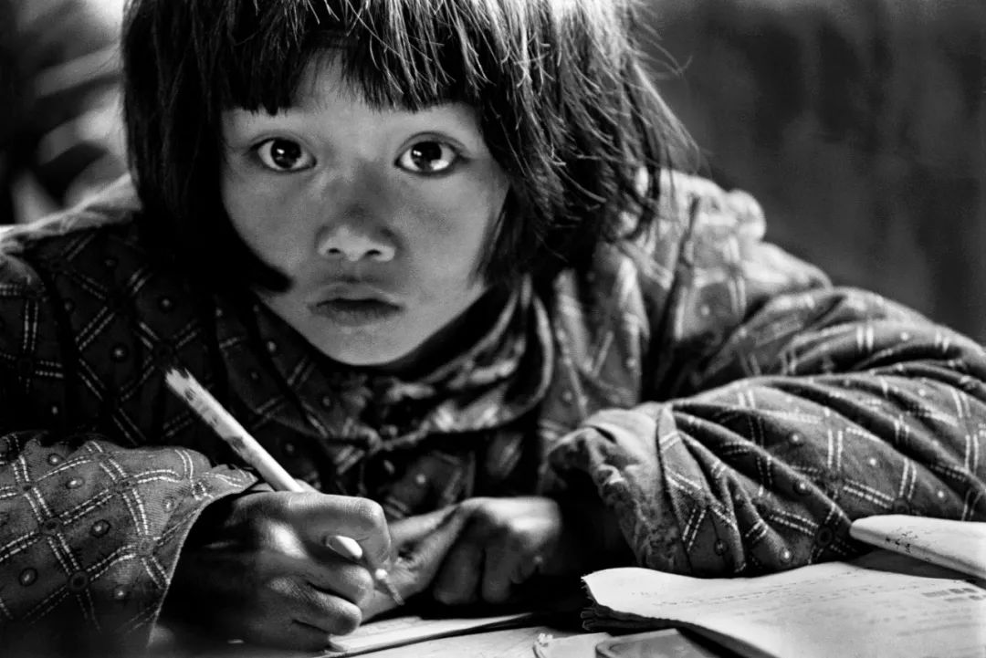 1991年 4月,安徽省金寨县三合中心小学苏明娟(大眼睛女孩)在课堂上。摄影/解海龙