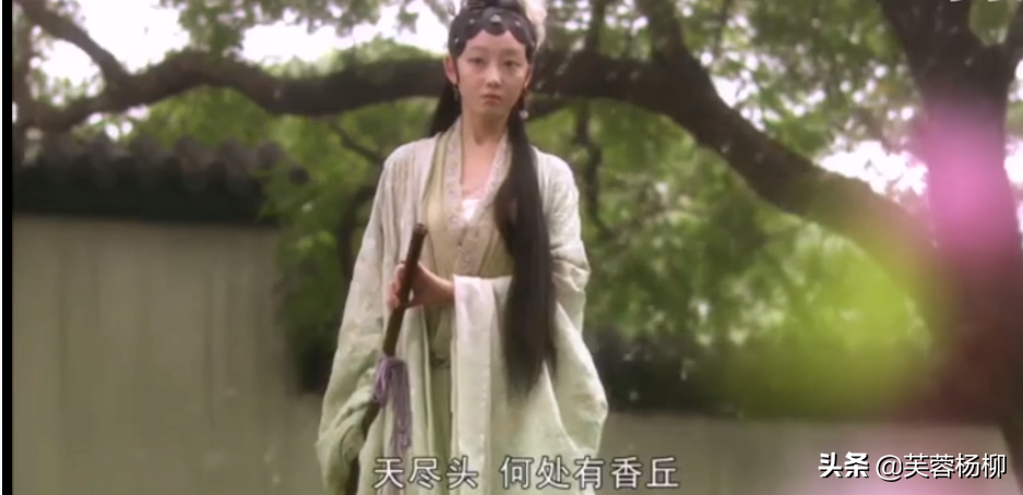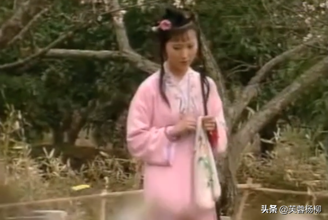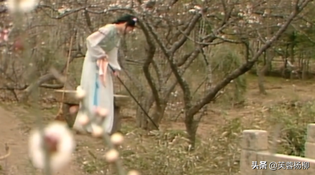 87版《红楼梦》很好地还原了这个场景,黛玉肩上担着花锄,锄上挂着花囊,行动如弱柳扶风,体态柔弱纤细,葬花的时候微微啜泣,偶尔会用手帕抹去眼泪。