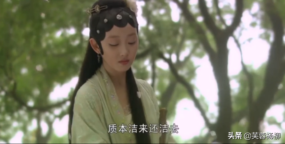 先看服装,开始黛玉穿了一套粉红色的服装,在桃花丛中徘徊,触景生情。当她准备葬花的时候,换了一套服装,一套嫩绿色的裙装。