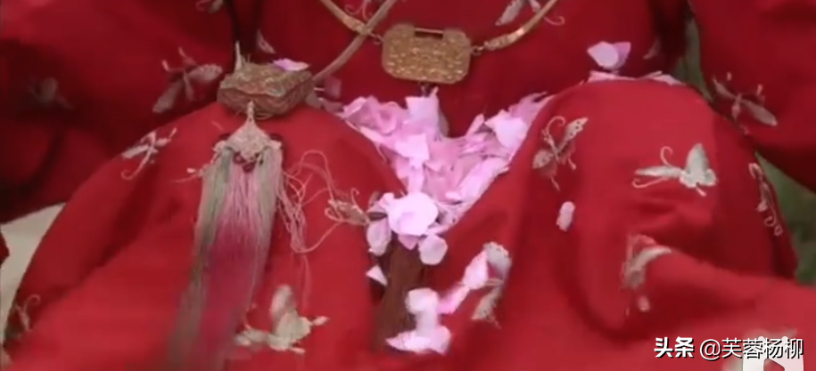 宝玉捡起满地的花朵,给了这些花朵一个特写,这些粉色的花,太廉价了,一看就是塑料花。
