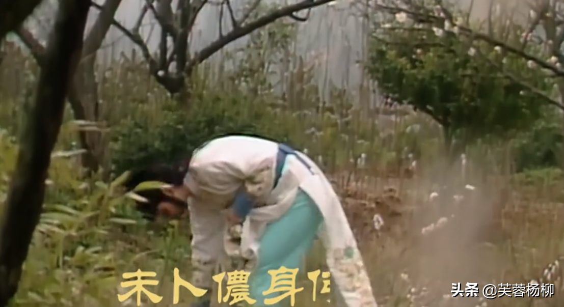 关于如何“葬花”,书中说得很清楚,“装在这绢袋里,拿土埋上”。老版黛玉再次真实还原了这个场景,把绢袋埋上。