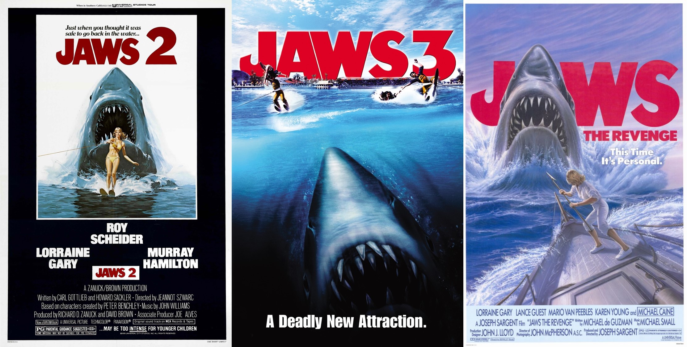 三部续作的海报p.s.《大白鲨》有三部续集,除了《大白鲨2》(1978)口碑尚可,票房超过一亿美元外,另两部《大白鲨3》(1983)和《大白鲨4》(1987)都是不值得一看的烂作。