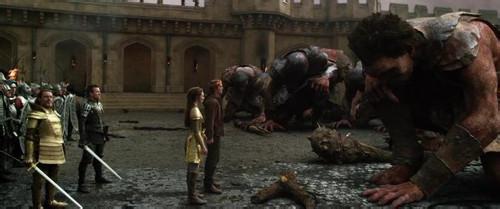 刚下映的国产电影《101次求婚》中屌丝黄渤成功逆袭白富美林志玲,这部美国电影《巨人捕手杰克》里屌丝杰克又上演完美逆袭,对象升级为公主。如今中外电影制片方替底层民众代言,注射兴奋剂,营造七彩肥皂泡的市场策略似乎是达到了高度默契。一个普通的农户小子,既无超人的智慧,又无天生神力,阴差阳错被动地卷入到一场关系人类命运的战斗当中,凭借着“窈窕淑女君子好逑”的朴素动机,竟然最后还抱得美人归。