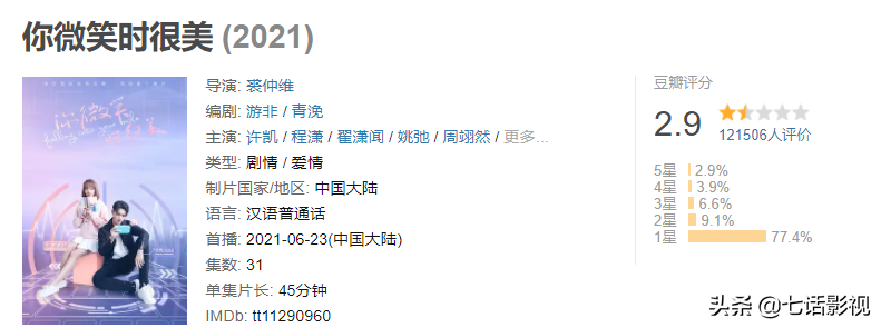 2021国产剧口碑新低分出炉了,许凯、程潇主演的网剧《你微笑时很美》喜提豆瓣12万+观众打出的2.9分,堪称影视圈“奇景”。