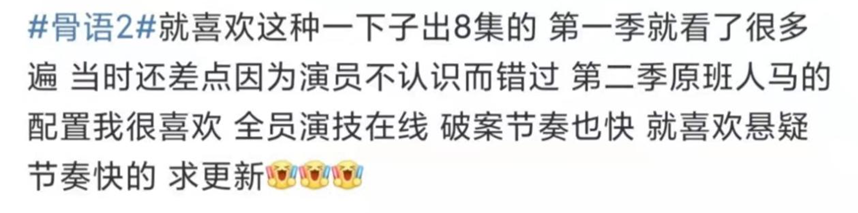 因此,《骨语》第一季一播出,就俘获了刑侦剧粉们的心。因此,作为《骨语》的续作,原班人马的回归,更是的回归更是让老剧粉们倍感欣慰。