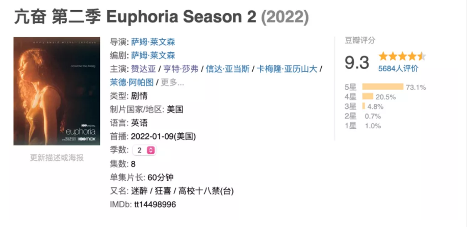 最近一股“亢奋风”从北美刮到中国,不管是剧情、人物、还是剧中角色的服装搭配与妆容都引起网友广泛讨论。而《亢奋》第二季的口碑直接超越第一季,豆瓣评分高达9.3分。