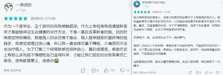 " 笔者依稀记得年前那阵子《神医》有着高达 9.5 的 tap 评分,曾一度霸榜热门榜单多日。如今游戏依旧有着 9.4 的出色评价,在超过了 7500 条的评论中,玩家对作品可谓赞不绝口,甚至还引发了诸多医学生的共鸣。