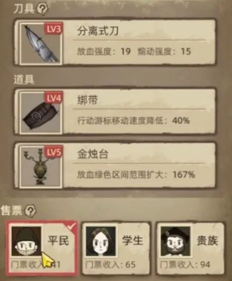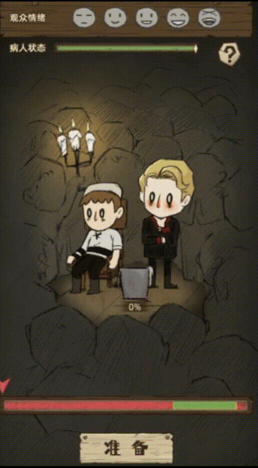 而绿色区域及黄色区域的长短也将决定玩家游戏的难易程度,玩家需要花费金钱购买一些道具帮助自己以最快的速度、最准确的下刀时机完成每一次手术,道具分别有刀具、道具两大类。