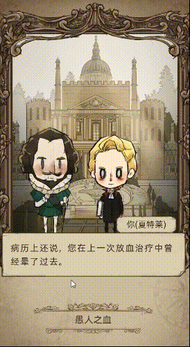 " 有这样一款游戏:视金盏花、黑胡椒或是洋葱混合下的产物为药剂,而患者吞服后只要能活着走出医院便算是治疗成功,但出了这个门,你的死活基本与上帝挂钩;以放血为治疗手段,某些患者甚至几天不放血都浑身难受……