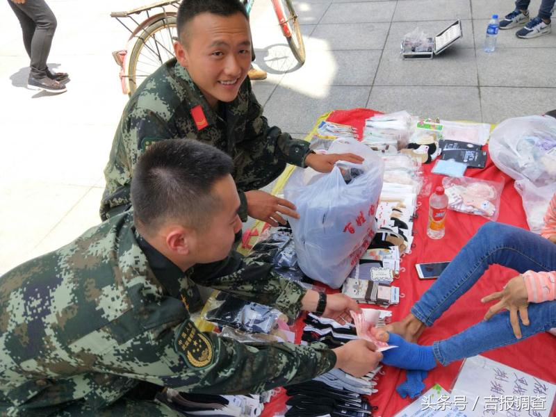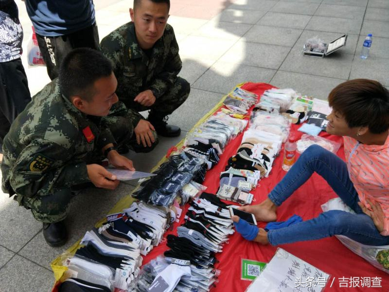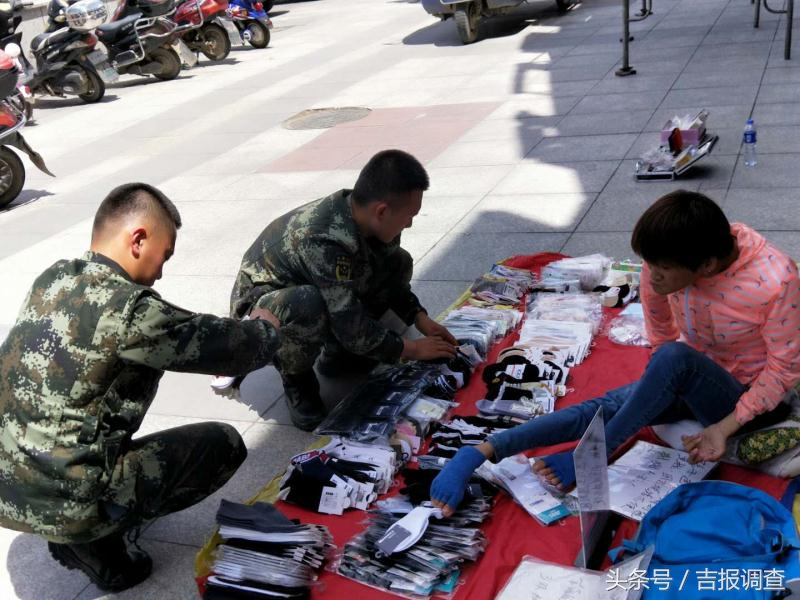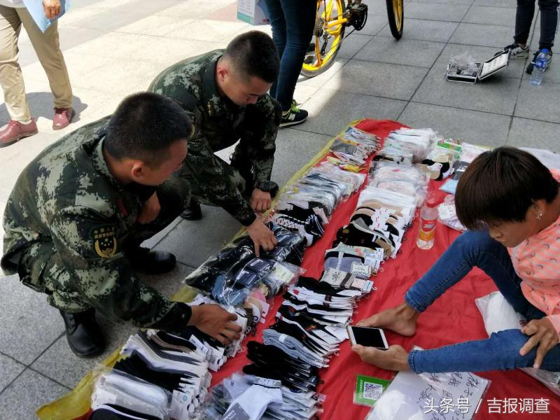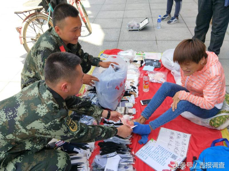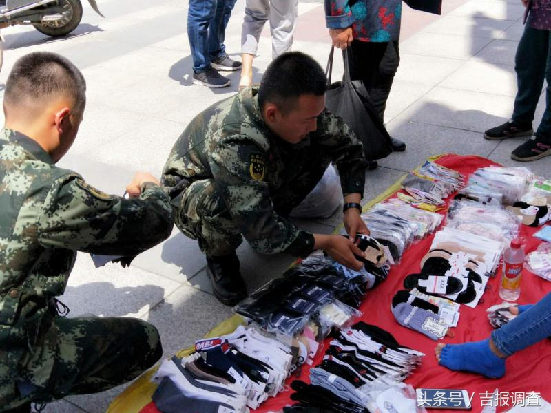 6月20日,在珲春市农贸市场附近的一卖袜子的摊位前,两名武警官兵代表中队团购了这位摊主的袜子,在付款之后,官兵并没有马上离开,而是耐心细致地为摊主把袜子一沓一沓拿起来,抖落掉上面的灰尘,然后轻轻地擦去摆放袜子的摊布上的灰尘,又一沓一沓摆好。虽然这是一个小小的举动,但是,对于摊主来讲,她本人是无法完成的,这位摊主盖娜是一个肢体语言重一级残的残疾人,她的双手没有任何功能,靠着顽强的毅力,她学会了用脚打理生活,她学会了用脚打字、画画、剪纸等。盖娜很坚强,靠着街头摆摊儿卖袜子维持生存,照顾女儿,不等不靠。社区工作人员每天都为盖娜伸出援手,帮助她写好宣传板,标出价格。武警珲春中队是在与共建单位河南街永盛社区搞活动时听到了盖娜的事迹,她的坚强与自立感动了武警珲春中队的官兵,所以武警官兵决定集体团购盖娜的袜子。