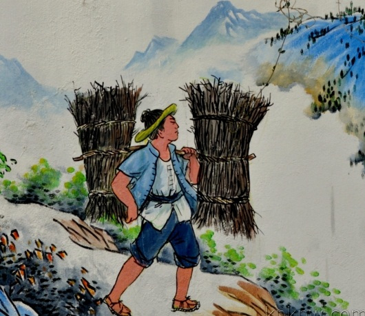 那日,姜子牙如同往常一般独钓于渭水,一樵夫常常见他在此钓鱼,钓钩却又是一直针,不是弯钩,便笑话他愚拙,又问其名,姜子牙说他叫姜尚,号飞熊,那人叫武吉,更是大笑,说你又不是圣人高人,还取一号。