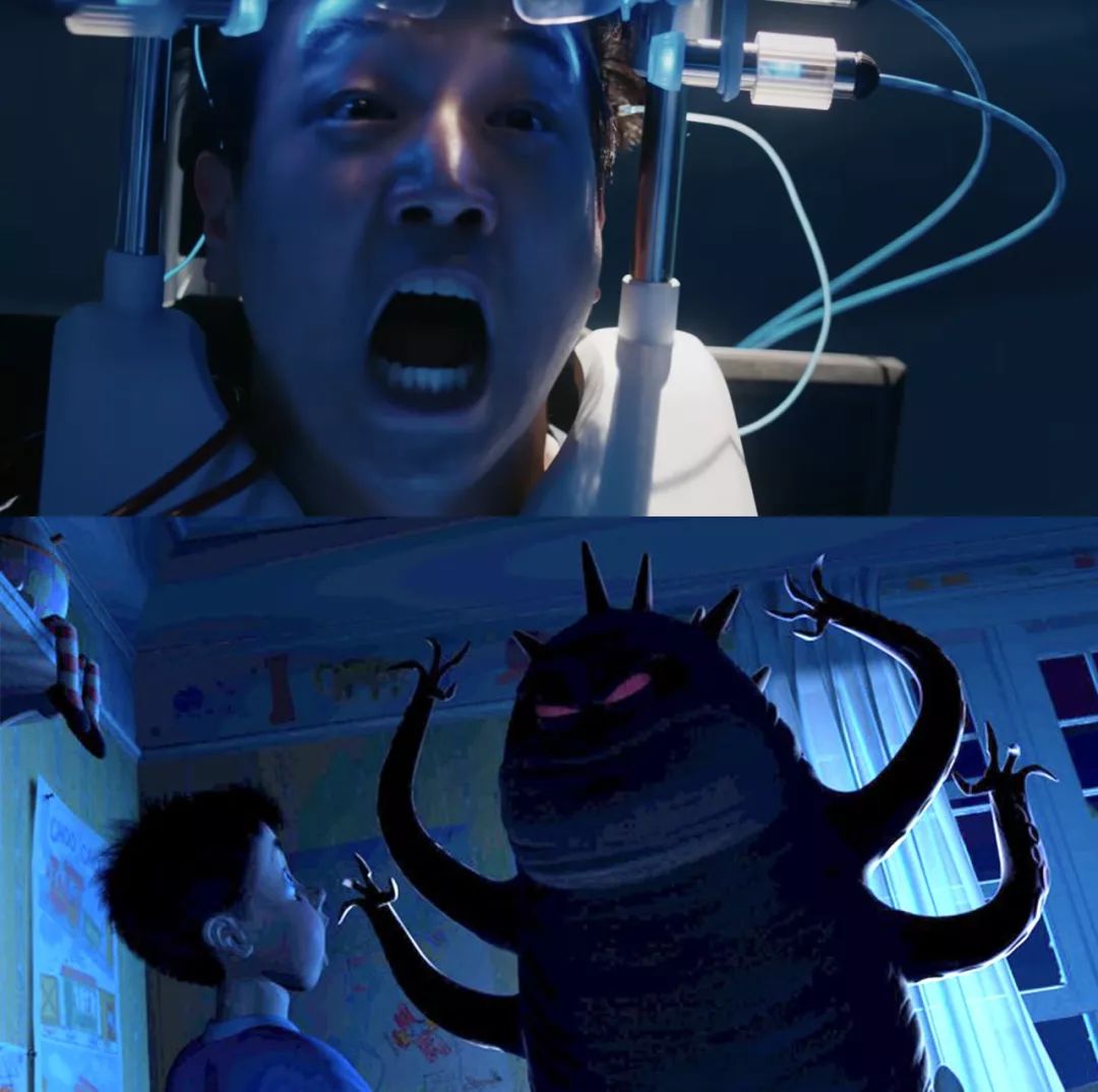 再来影片中关于米诺血清的提取,要用惊吓的方式提取出来的血才是最有效的,影片这样设计,小心《怪兽电力公司》告你们抄袭呀。