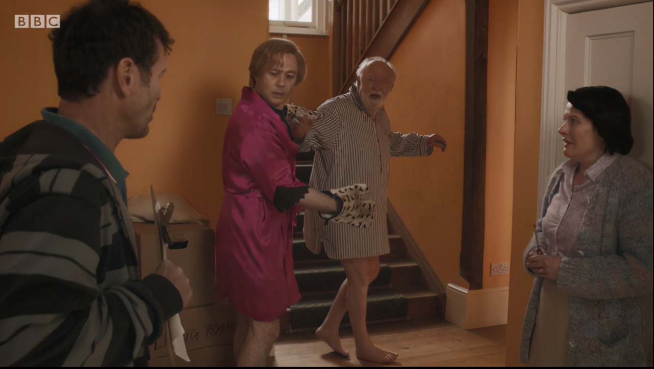 搬迁公司员工斯派克去雇主法尔莎姆太太家搬东西,法尔莎姆却说还没有收拾好,而且房子的下家也没有找到。这时男主人朱利安走了过来,他告诉法尔莎姆蛋糕已经烤好了。法尔莎姆太太解释道蛋糕是为了送给过来租房子的人。斯派克准备改天再来,正要离开时,一位虚弱的老头下了楼并质问有没有看到他的水杯,话还没说完,他就喷了一口血出来。
