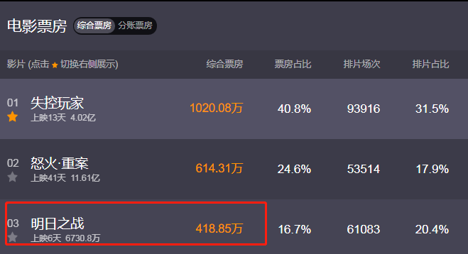《明日之战》的口碑崩盘反而给了《怒火·重案》票房反超的机会,截止发稿《怒火》的日票房已经达到了620万,累计票房也有11.6亿多,在这周末假期的加持下完全有可能冲破12亿票房大关。