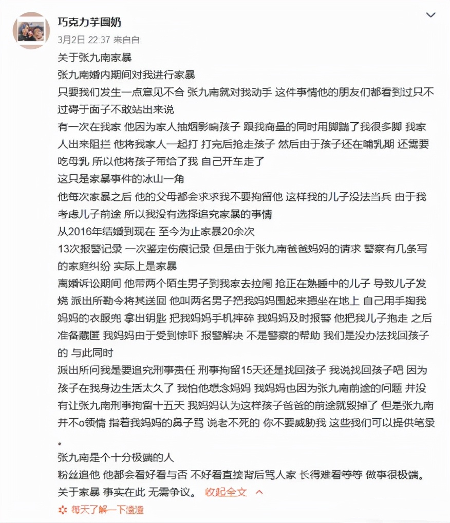 3月2日晚,张九南的妻子裴爽发文控诉张九南,裴爽称自2016年结婚至今,她被张九南家暴了20多次,她还说张九南约粉,出轨多次。