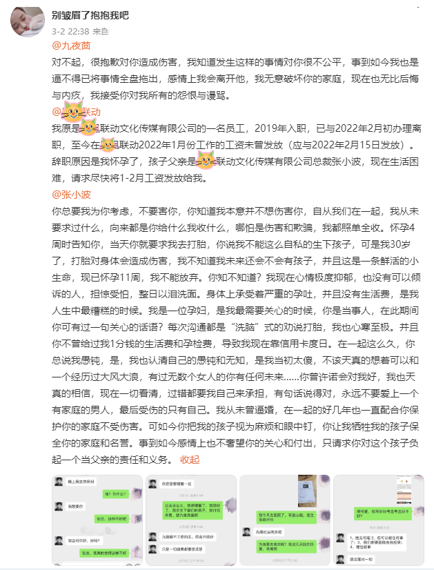 目前,对于“别皱眉了抱抱我吧”和“老妖女士”的爆料,九夜茴和张小波都没有做出回应。