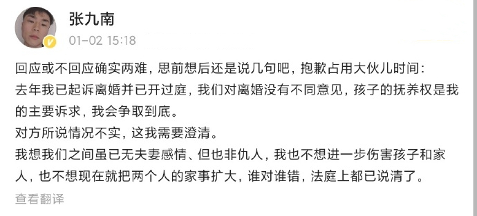 实际上这已经不是裴爽第一次在网上发文控诉张九南。去年年底,裴爽就闹了一回,最终以张九南一句“谁对谁错,法庭上都已说清了”结束。