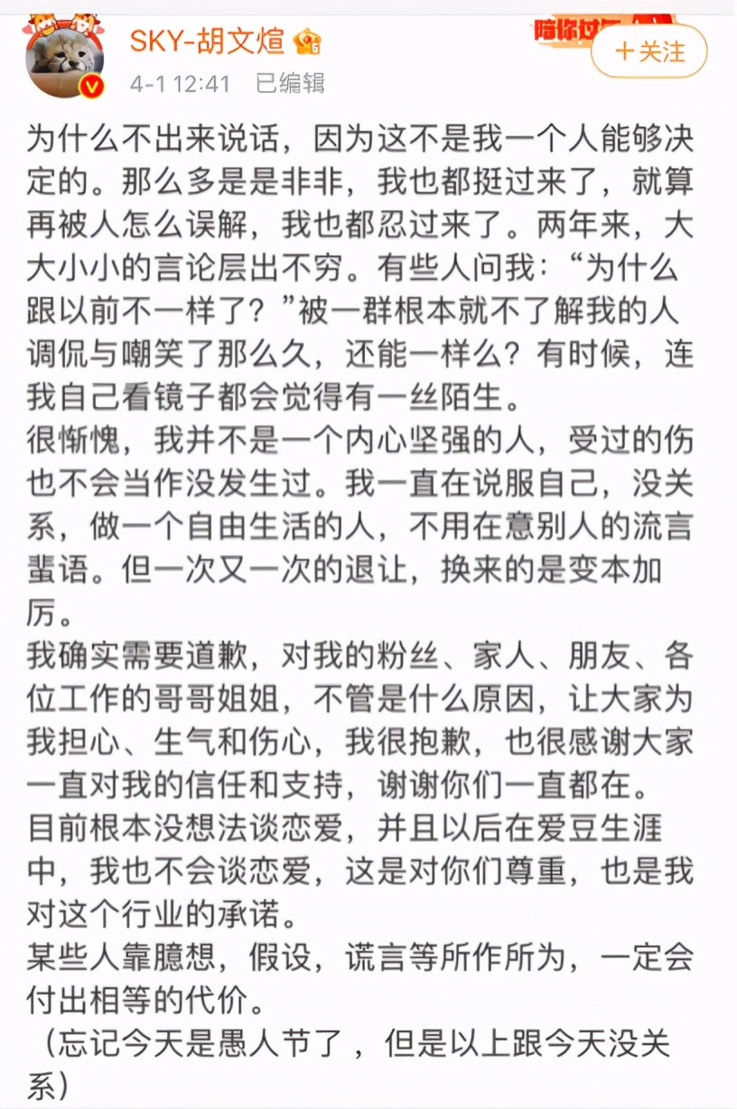 当时对于外界沸沸扬扬的舆论,胡文煊在愚人节那天发文做了回应,他说他迟迟没有发文解释是因为这不是他一个人可以决定的。