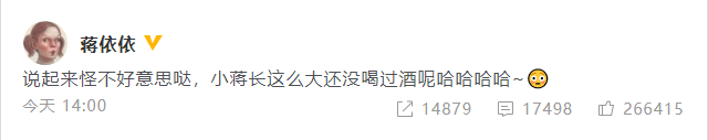 面对再一次和郭麒麟有了绯闻,这一次蒋依依做出了回应,她在个人社交账号上发文“小蒋长这么大还没喝过酒呢”,间接辟谣了自己和郭麒麟的绯闻。