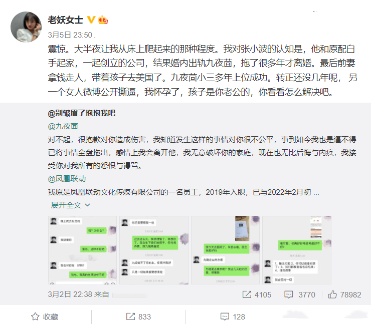 有意思的是在这个事情发酵的过程中,一位名叫“老妖女士”的网友爆料称当年九夜茴是小三上位,知三当三。