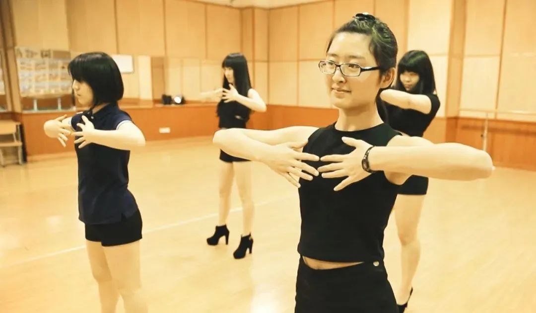 最后汇报演出的那一场,这个羞涩的女孩穿上黑色紧身衣、短裤、高跟鞋,在队列中,努力地去展现自己的美,成了高中阶段,她非常高光的时刻。