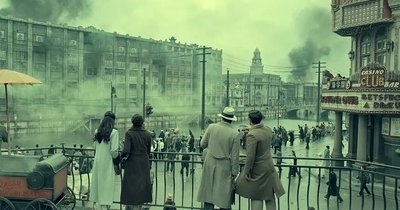 而剧情的推进也很依赖桥和河,欧豪这个人物的成长弧光是从好几次偷渡递进的,他这次不是英雄,是一个平平凡凡的普通人,开不了枪杀不了人,只是想带着小湖北活下去,但是当他游在那条河中,背后是战火,眼前是租界的时候,他到底还是选择了回去。活着和苟活的差别也是在一念之间的。再提到结局的那一场戏,死得惨烈,无数条生命在那座桥上轰轰烈烈地死在了外国媒体的摄影机之前,也死在了同胞伸出的手之前,一座桥,成了无法突破的鸿沟,过不去,活不下去,就像战争。