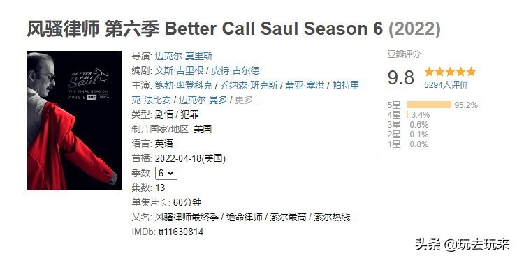 美剧《风骚律师》最终季已经正式开播,海外口碑大爆,有着烂番茄100%新鲜度和100%爆米花指数。该剧集在豆瓣也获得了高达9.8分的成绩。截止发稿时,《风骚律师》在豆瓣的5294个评分中,95.2%的豆瓣网友给出了五星好评。