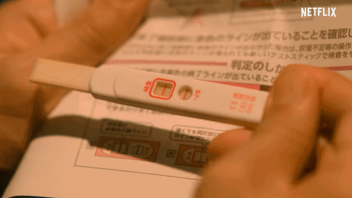 男主有一天发现自己中彩了,慌乱地盯着验孕结果看。