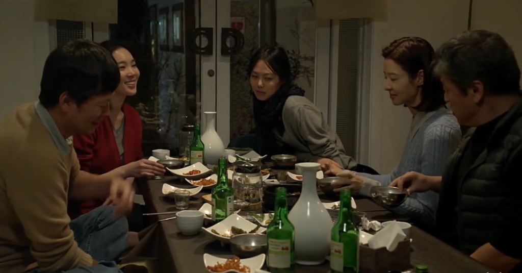 聊到人快散时,金敏喜饰演的女演员又贪杯醉倒在餐桌边,一下让人想起她在《独自在海边的夜晚》里的样子。