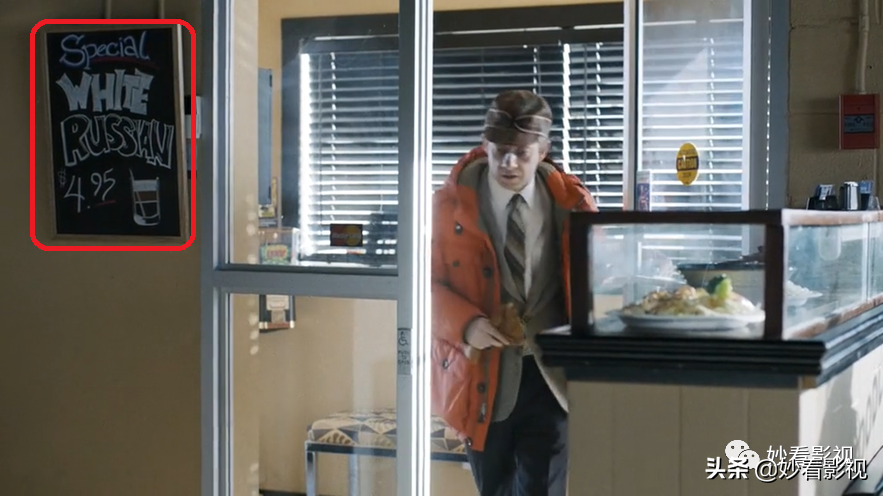 当莱斯特走进勒罗伊汽车旅馆的咖啡馆时,背景中有一块小黑板,上面写着“特殊的俄罗斯白人$4.95”(special white russian $4.95)。