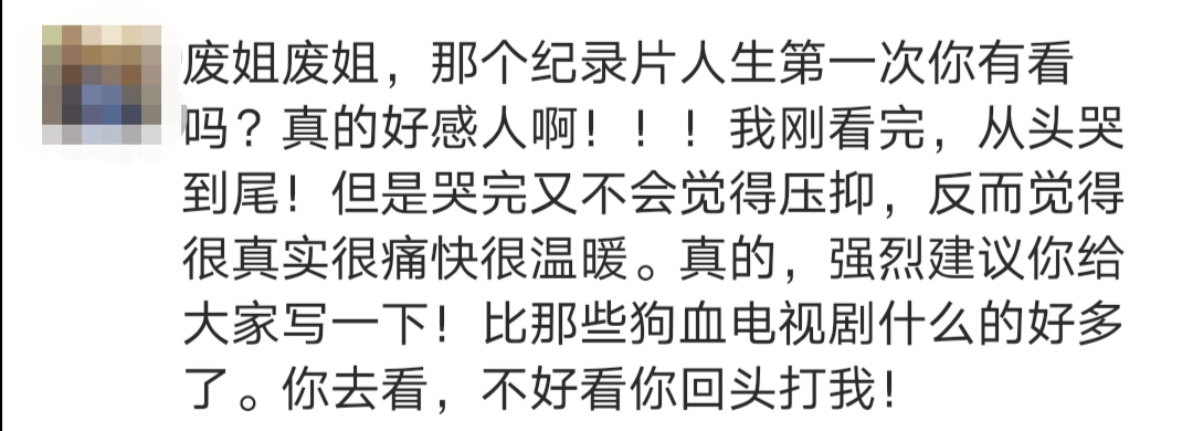 前两天,有宝贝给废姐发私信,安利一部国产纪录片《人生第一次》。