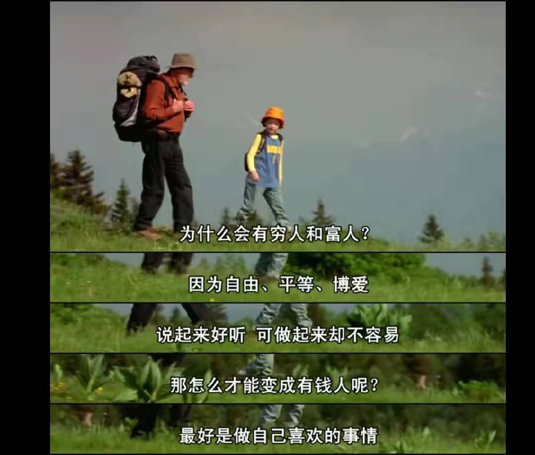 一起在山间小屋用餐时,一名登山者的股票瞬间赚了35万美元,艾尔莎也问了我们的孩子经常迷惑的问题,为什么会有穷人和富人,怎样才能有钱。于廉告诉她:只有做自己喜欢的事情才是真正的富有。