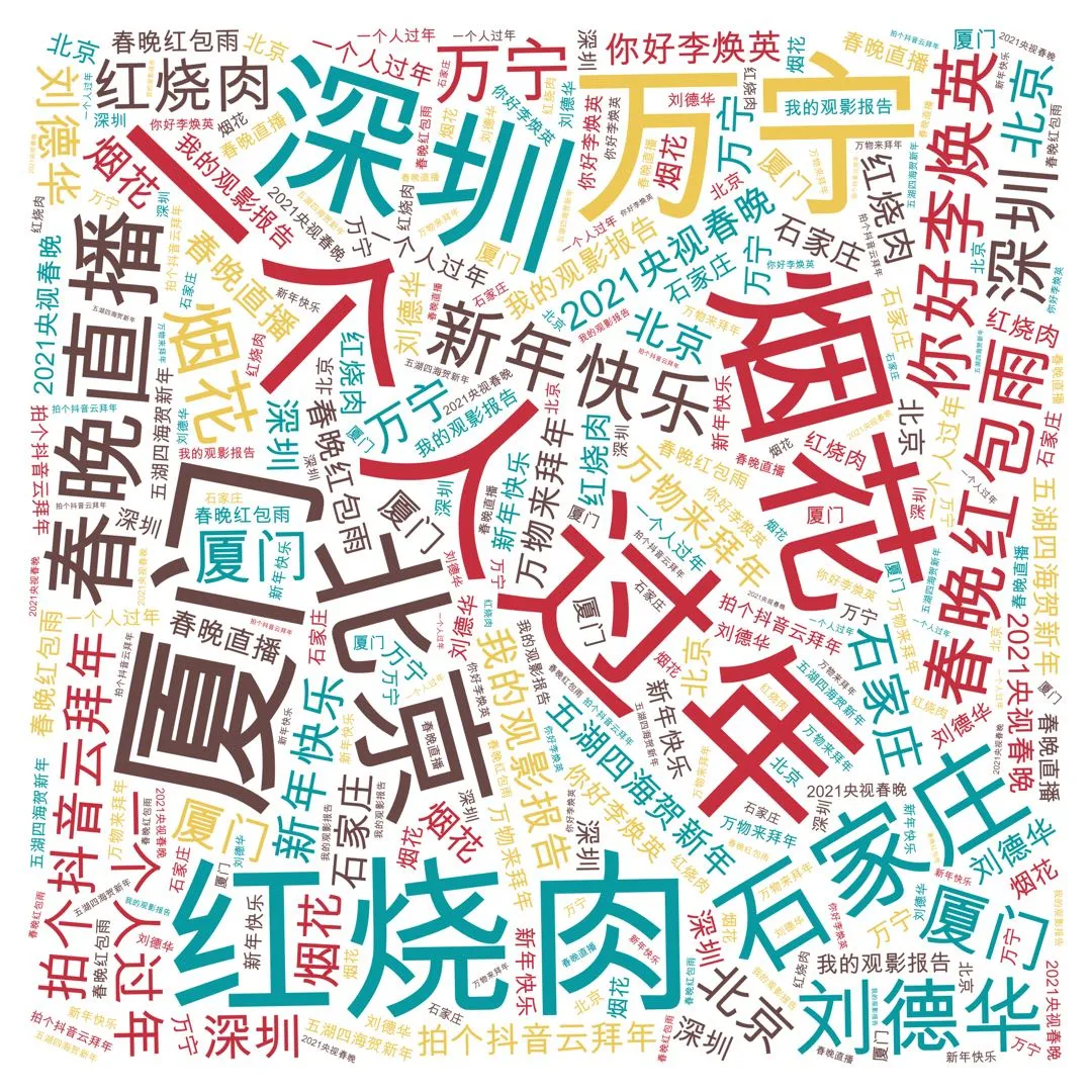 抖音发布的《2021抖音春节数据报告》中显示,“一个人过年”被搜索8万次,“红烧肉”被搜索101万次,“烟花”被搜索448万次。