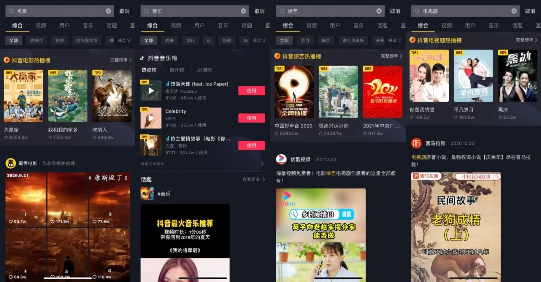 截止2020 年 12 月,抖音日均视频搜索量突破4亿。在抖音搜索中,搜索“电影”、“综艺”、“电视剧”“音乐”等关键词,可进入相关频道,用户可观看相关节目视频。