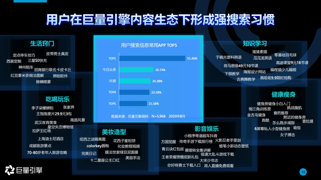 巨量引擎发布的《2020搜索广告营销通案》显示,用户搜索行为去中心化,向内容平台迁移,63%受众会使用不同平台搜索不同内容,90%受众认为视频内容对做决策有帮助。用户搜索覆盖吃喝玩乐、美妆造型、知识学习、影音娱乐、健康瘦身、生活窍门等领域。