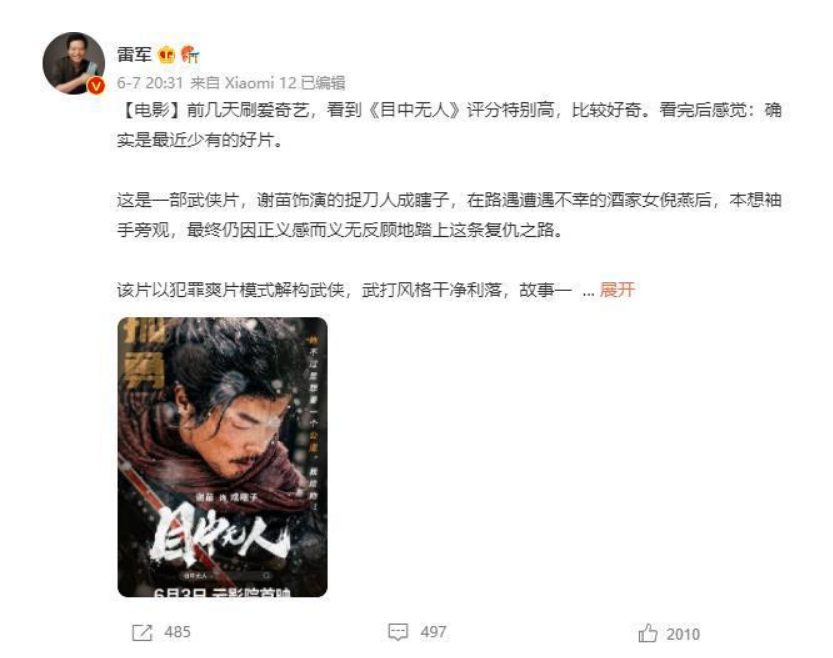 雷军可是出了名的挑剔,在发布会上都可以大骂友军是**的人,能够获得他的一致好评也实属不易,那这部《目中无人》到底哪里可以值得雷大佬公开称赞呢?