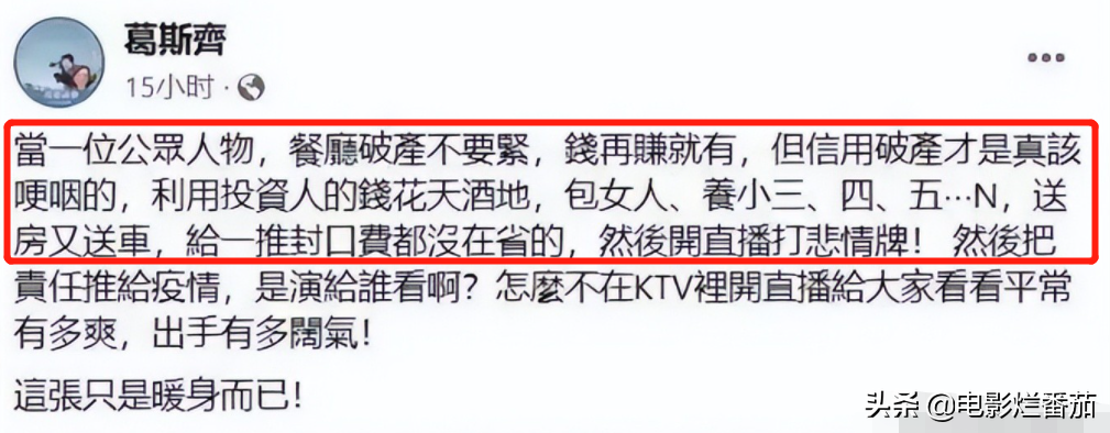 其实,早在五月中旬,葛斯齐就在社交平台上感慨过:当一位公众人物,餐厅破产不要紧,但信用破产才是真该哽咽的。